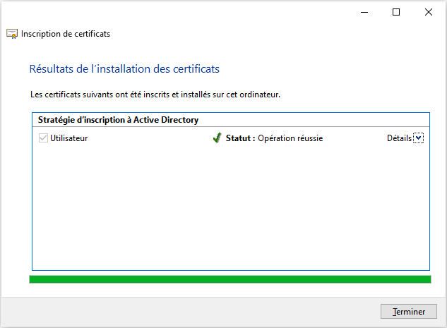 • À l'étape Résultats de l'installation des certificats, vérifier que le statut soit Opération réussie puis cliquer sur le bouton Suivant.