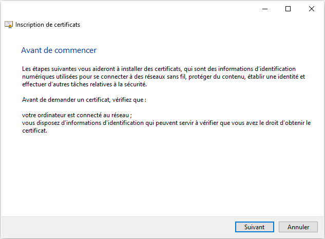 3. L’assistant Inscription de certificats démarre. Cliquer sur le bouton Suivant à l’étape Avant de commencer.