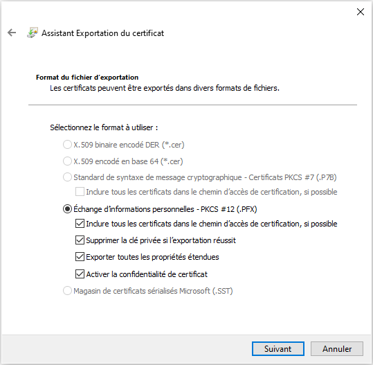 • À l'étape Format du fichier d'exportation, sélectionner l'option Echange d'informations personnelles - PKCS, puis :