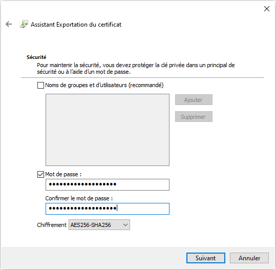 • À l'étape Sécurité, saisir à deux reprises un Mot de passe dans les champs appropriés, puis cliquer sur le bouton Suivant.