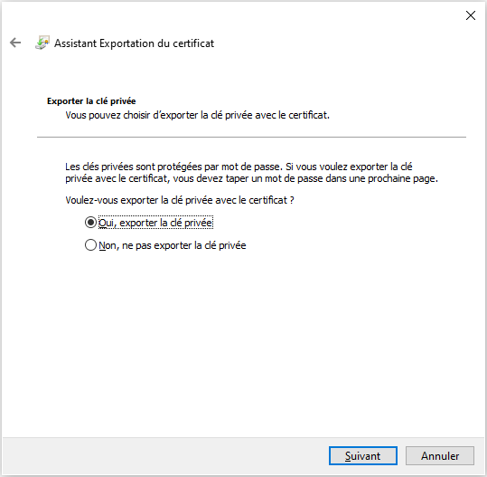 • À l'étape Exporter la clé privée, sélectionner l'option Oui, exporter la clé privée, puis cliquer sur le bouton Suivant.