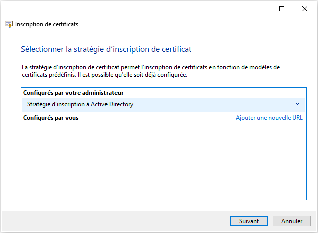 • À l'étape Sélectionner la stratégie d'inscription de certificat, sélectionner l'option Stratégie d'inscription à Active Directory puis cliquer sur le bouton Suivant.