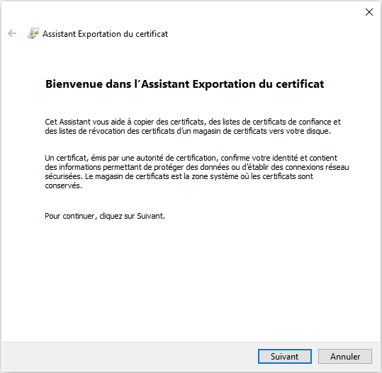• À l'étape Bienvenue dans l'Assistant Exportation du certificat, cliquer sur le bouton Suivant.