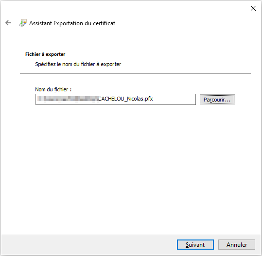 • À l'étape Fichier à exporter, sélectionner le dossier d'exportation du certificat, puis cliquer sur le bouton Suivant.