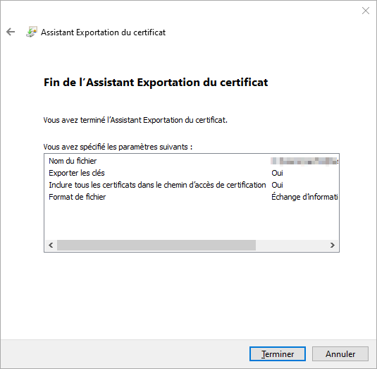 • Activer l'option Supprimer la clé privée si l'exportation réussie.