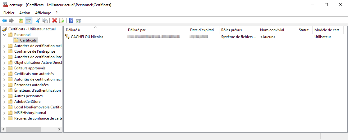 • De retour sur la console Gérer les certificats utilisateurs, développer Certificats / Personnel / Certificats puis vérifier la présence du certificat généré à l'étape précédente.